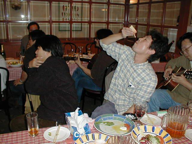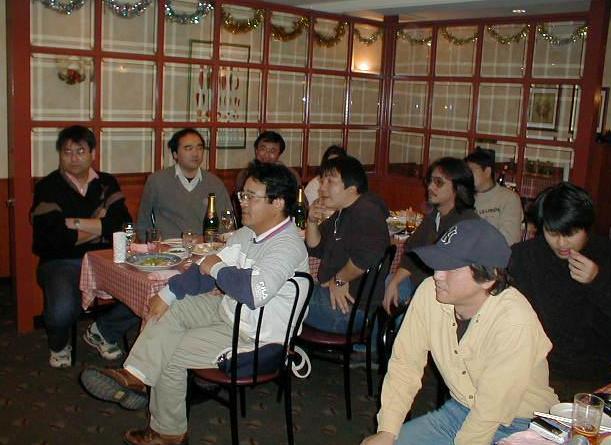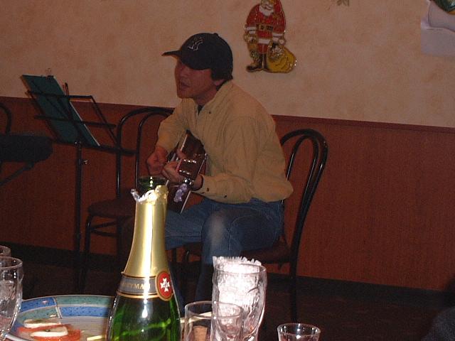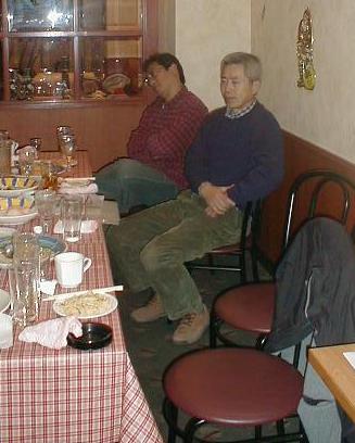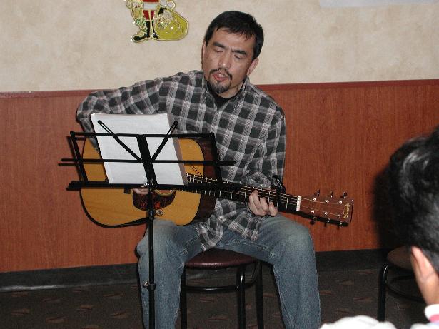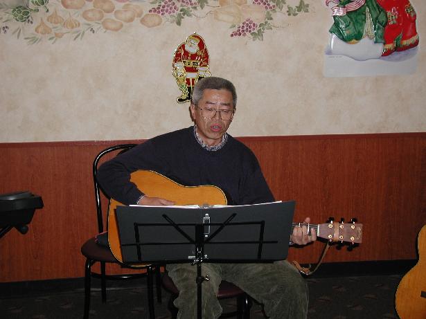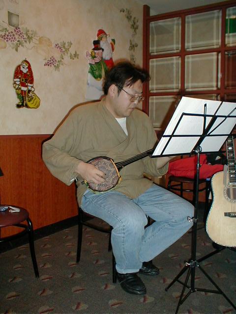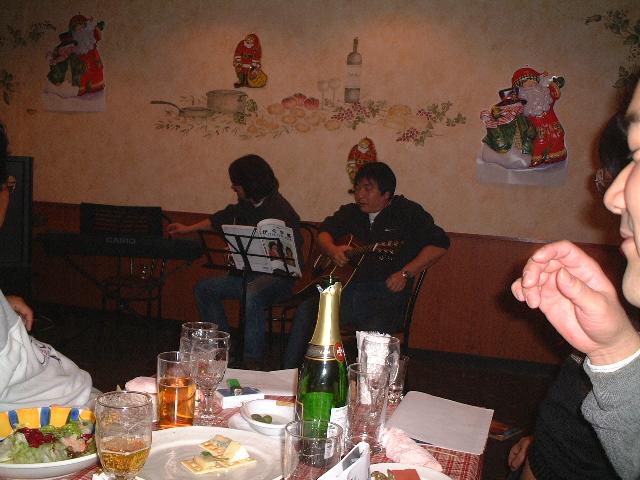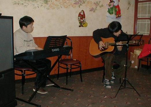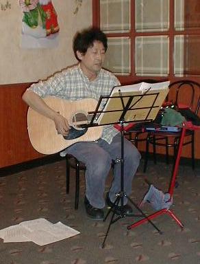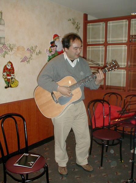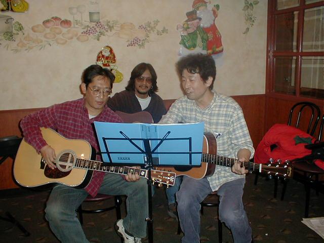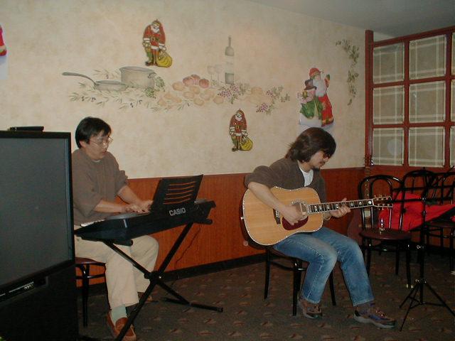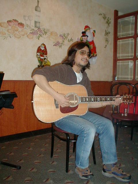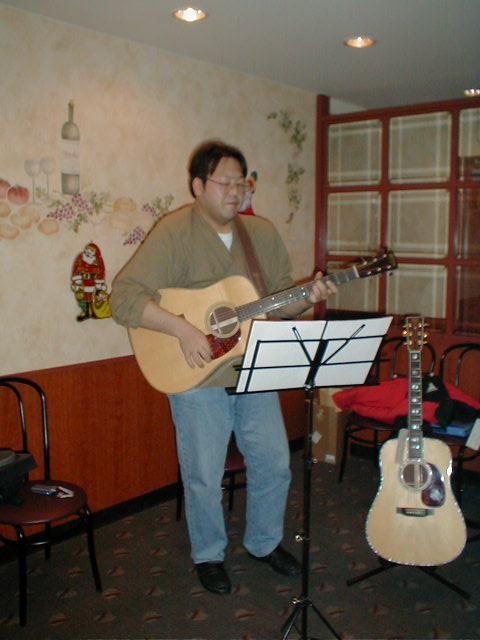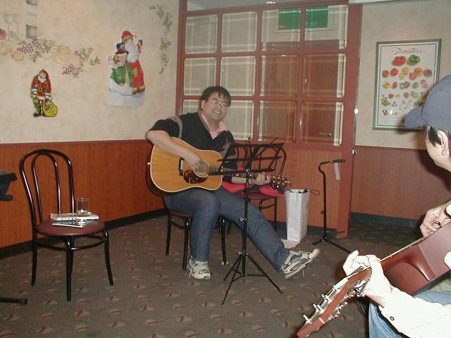 | 2001年12月22日(土)午後10:00から23日(日)午前10:00まで、 柏市のレストラン“キッチンパタータ”にて、唄とギターの忘年会を行いました。 年末で、疲れのたまった中年オヤジにとっては、かなり無謀な試みであり、 途中で気を失いそうになりながらも、思い出したように写真を撮ったのですが、 残念ながら、途中からよく覚えていません。 (忘年会の詳細は>>>こちら) |