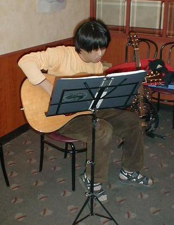| 合間には、こんな感じでセッションが行われて いました。後ろのほうにギターが見えますが、 16人の参加(うち3人はギターを弾かず)で、 30本近くあったのではないでしょうか? |