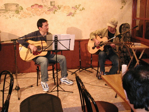 | 2番手のBe-m(中村、正木)。演奏中にもかかわらず、カメラを向けると、“ハイ、ポーズ!” | 3番手は小関さん。岸部さんが20年以上前に師事していた中川イサトさんの曲を中心に、見事に観客をつなぎとめていました。 |
